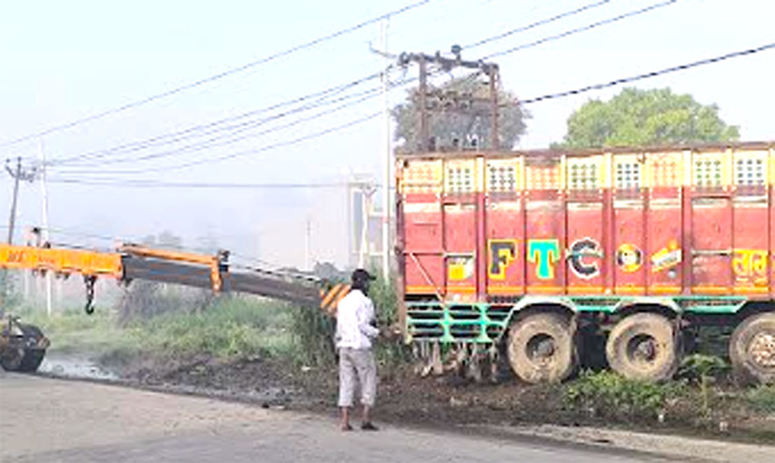 हरिद्वार। रविवार अल सुबह करीब 3.30 बजे ग्राम धारीवाला स्थित शनि देव मंदिर के सामने एक तेज रफ्तार ट्रक अचानक अनियंत्रित हो गया। ट्रक सड़क पर आई गाय को बचाने के प्रयास में बिजली के पोल को तोड़ते हुए पास के नाले और एक दुकान के फर्श से जा टकराया। हादसा इतना जोरदार था कि ट्रक का अगला धुरा और कमानी अलग हो गए। गनीमत रही कि इस दुर्घटना में कोई जनहानि नहीं हुई।
