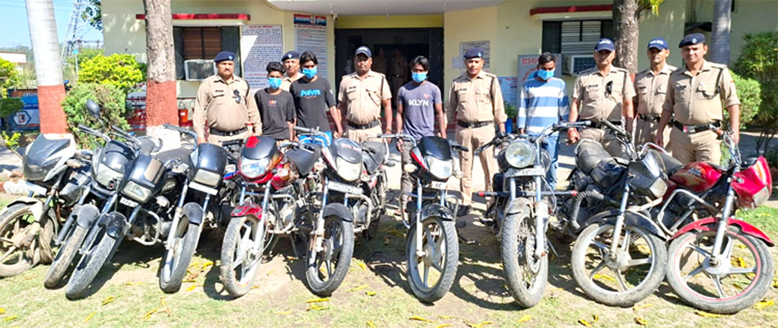 हरिद्वार। वरिष्ठ पुलिस अधीक्षक नवनीत सिंह के निर्देशन में जनपद में अपराधियों के खिलाफ चलाए जा रहे अभियान के तहत कोतवाली रानीपुर पुलिस को बड़ी सफलता मिली है। पुलिस ने कार्रवाई करते हुए 04 वाहन चोरों को गिरफ्तार कर उनके कब्जे से चोरी की 10 मोटरसाइकिलें बरामद की हैं। पुलिस के अनुसार गिरफ्तार चारों आरोपी नशे के आदी हैं और अपने नशे की पूर्ति तथा शौक पूरे करने के लिए वाहन चोरी की घटनाओं को अंजाम देते थे।
